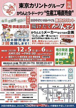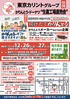 東京カリント本社(板橋区)での蔵出しセールを下記日程にて開催いたします。当日は「揚げたてかりんとう」や「はねだしドーナツ」など、お買い得商品を多数ご用意いたします!!皆様のご来場を心よりお待ちしております。